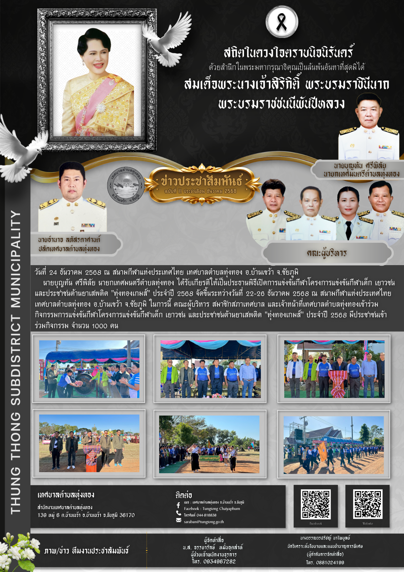 นายบุญทัน ศรีพิลัย นายกเทศมนตรีตำบลทุ่งทอง ได้รับเกียรติให้เป็นประธานพิธีเปิดการแข่งขันกีฬาโครงการแข่งขันกีฬาเด็ก เยาวชน และประชาชนต้านยาเสพติด "ทุ่งทองเกมส์" ประจำปี 2568 จัดขึ้นระหว่างวันที่ 22-26 ธันวาคม 2568 ณ สนามกีฬาแห่งประเทศไทย เทศบาลตำบลทุ่งทอง อ.บ้านเขว้า จ.ชัยภูมิ ในการนี้ คณะผู้บริหาร สมาชิกสภาเทศบาล และเจ้าหน้าที่เทศบาลตำบลทุ่งทองเข้าร่วมกิจกรรมการแข่งขันกีฬาโครงการแข่งขันกีฬาเด็ก เยาวชน และประชาชนต้านยาเสพติด "ทุ่งทองเกมส์" ประจำปี 2568 มีประชาชนเข้าร่วมกิจกรรม จำนวน 1000 คน