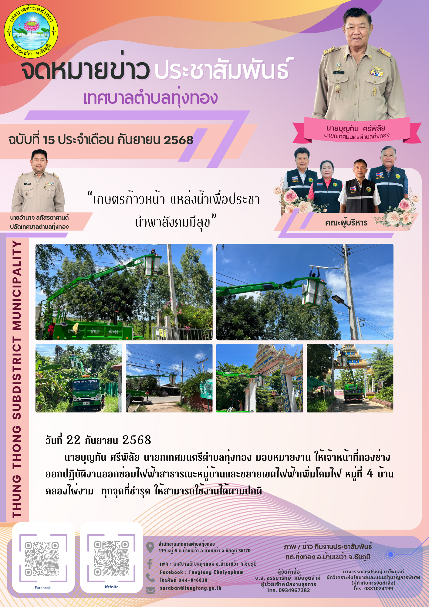 นายบุญทัน ศรีพิลัย นายกเทศมนตรีตำบลทุ่งทอง มอบหมายงาน ให้เจ้าหน้าที่กองช่าง ออกปฏิบัติงานออกซ่อมไฟฟ้าสาธารณะหมู่บ้านและขยายเขตไฟฟ้าเพิ่มโคมไฟ หมู่ที่ 4 บ้านคลองไผ่งาม ทุกจุดที่ชำรุด ให้สามารถใช้งานได้ตามปกติ