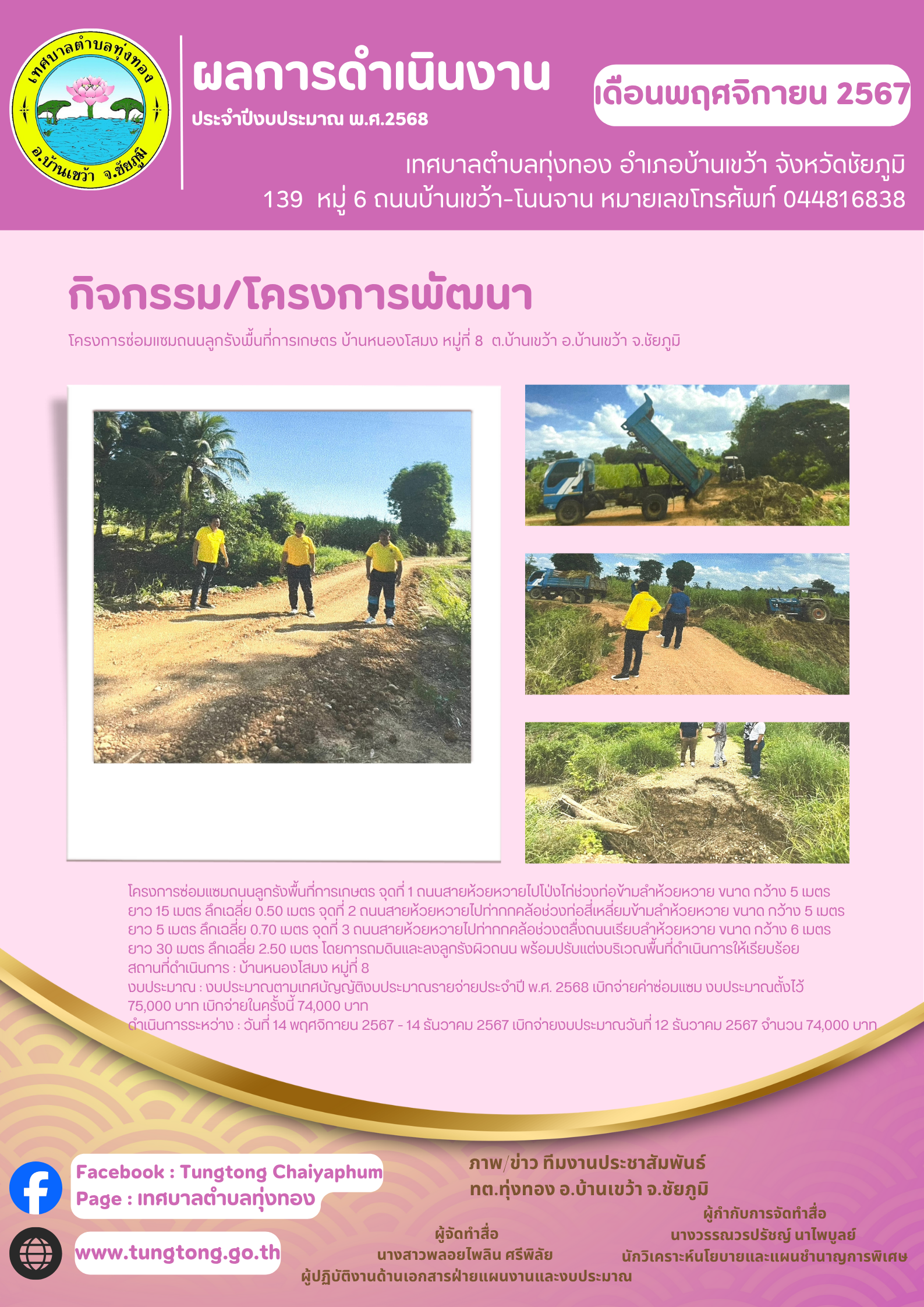โครงการก่อสร้างถนน คสล. ภายในเขตพื้นที่เทศบาลตำบลทุ่งทอง บ้านหนองโสมง หมู่ที่ 8 ต.บ้านเขว้า อ.บ้านเขว้า จ.ชัยภูมิ