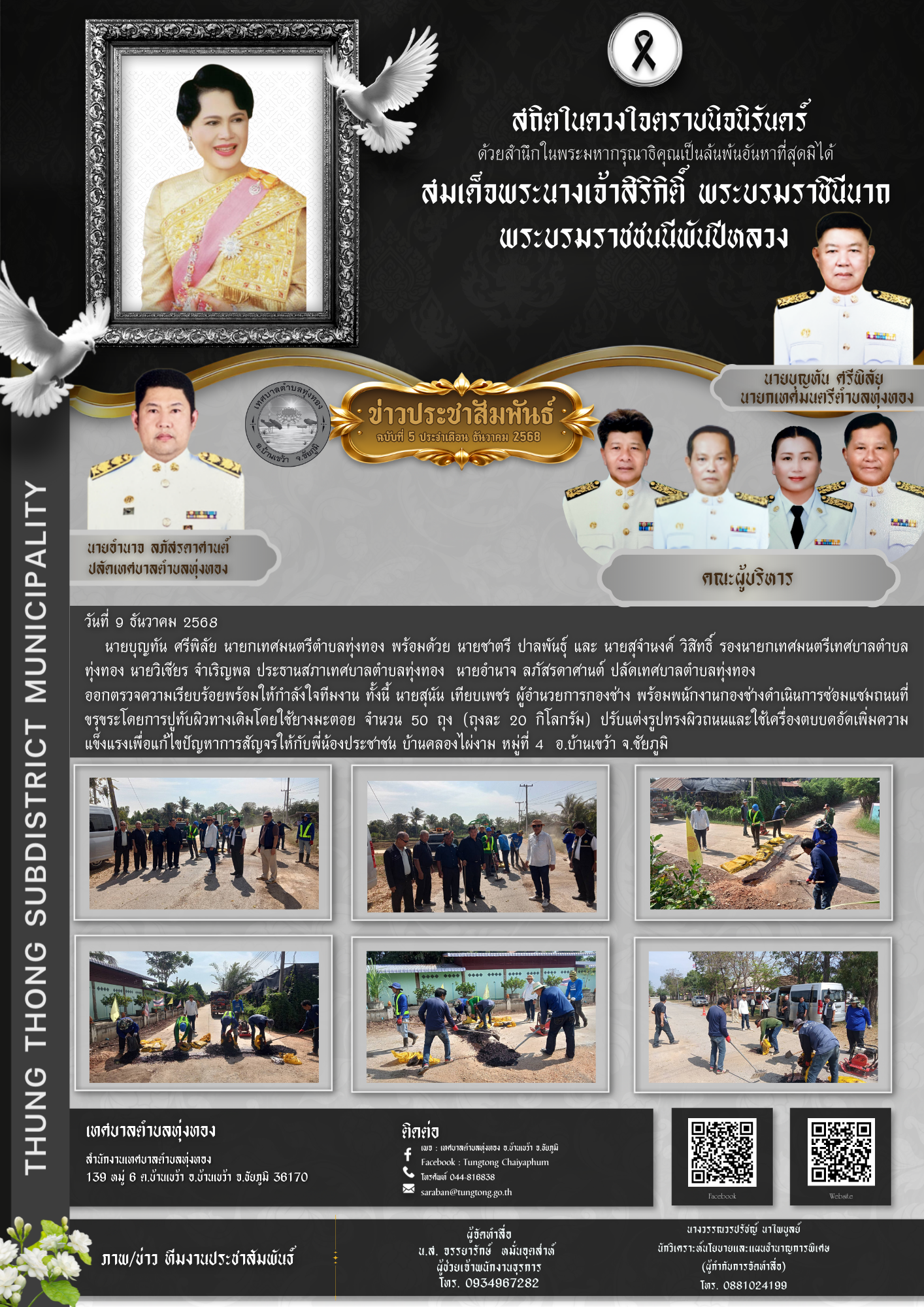 นายบุญทัน ศรีพิลัย นายกเทศมนตรีตำบลทุ่งทอง พร้อมด้วย นายชาตรี ปาลพันธุ์ และ นายสุจำนงค์ วิสิทธิ์ รองนายกเทศมนตรีเทศบาลตำบลทุ่งทอง นายวิเชียร จำเริญพล ประธานสภาเทศบาลตำบลทุ่งทอง นายอำนาจ ลภัสรดาศานต์ ปลัดเทศบาลตำบลทุ่งทอง ออกตรวจความเรียบร้อยพร้อมให้กำลังใจทีมงาน ทั้งนี้ นายสุนัน เทียบเพชร ผู้อำนวยการกองช่าง พร้อมพนักงานกองช่างดำเนินการซ่อมแซมถนนที่ขรุขระโดยการปูทับผิวทางเดิมโดยใช้ยางมะตอย จำนวน 50 ถุง (ถุงละ 20 กิโลกรัม) ปรับแต่งรูปทรงผิวถนนและใช้เครื่องตบบดอัดเพิ่มความแข็งแรงเพื่อแก้ไขปัญหาการสัญจรให้กับพี่น้องประชาชน บ้านคลองไผ่งาม หมู่ที่ 4 อ.บ้านเขว้า จ.ชัยภูมิ