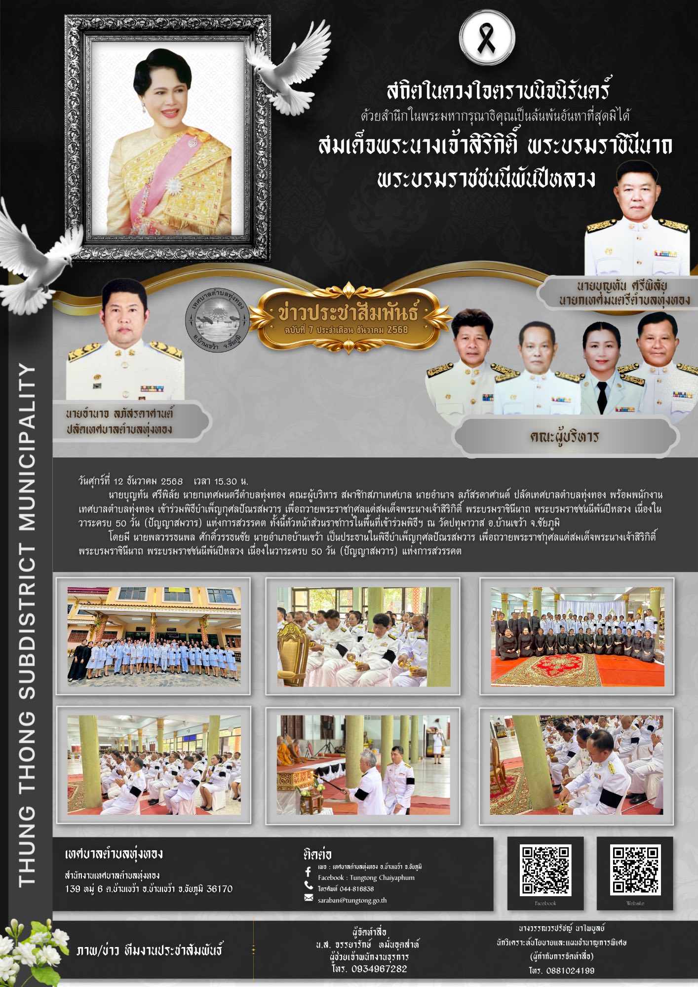 นายบุญทัน ศรีพิลัย นายกเทศมนตรีตำบลทุ่งทอง คณะผู้บริหาร สมาชิกสภาเทศบาล นายอำนาจ ลภัสรดาศานต์ ปลัดเทศบาลตำบลทุ่งทอง พร้อมพนักงานเทศบาลตำบลทุ่งทอง เข้าร่วมพิธีบำเพ็ญกุศลปัณรสมวาร เพื่อถวายพระราชกุศลแด่สมเด็จพระนางเจ้าสิริกิติ์ พระบรมราชินีนาถ พระบรมราชชนนีพันปีหลวง เนื่องในวาระครบ 50 วัน (ปัญญาสมวาร) แห่งการสวรรคต ทั้งนี้หัวหน้าส่วนราชการในพื้นที่เข้าร่วมพิธีฯ ณ วัดปทุมาวาส อ.บ้านเขว้า จ.ชัยภูมิ