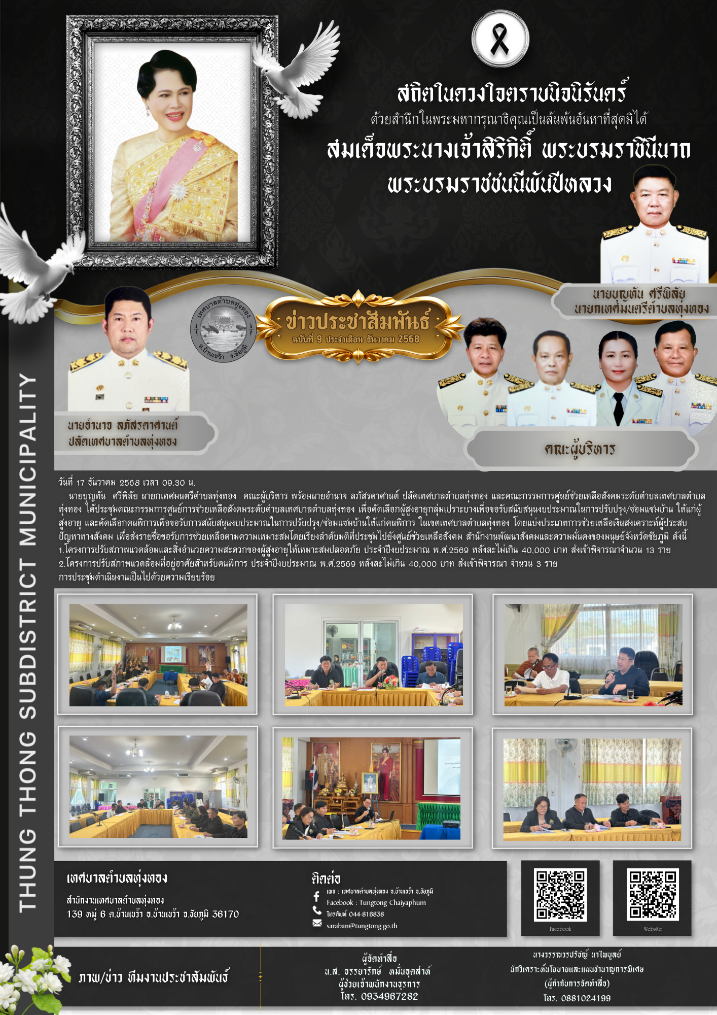 นายบุญทัน ศรีพิลัย นายกเทศมนตรีตำบลทุ่งทอง คณะผู้บริหาร พร้อมนายอำนาจ ลภัสรดาศานต์ ปลัดเทศบาลตำบลทุ่งทอง และคณะกรรมการศูนย์ช่วยเหลือสังคมระดับตำบลเทศบาลตำบลทุ่งทอง ได้ประชุมคณะกรรมการศูนย์การช่วยเหลือสังคมระดับตำบลเทศบาลตำบลทุ่งทอง เพื่อคัดเลือกผู้สูงอายุกลุ่มเปราะบางเพื่อขอรับสนับสนุนงบประมาณในการปรับปรุง/ซ่อมแซมบ้าน ให้แก่ผู้สูงอายุ และคัดเลือกคนพิการเพื่อขอรับการสนับสนุนงบประมาณในการปรับปรุง/ซ่อมแซมบ้านให้แก่คนพิการ ในเขตเทศบาลตำบลทุ่งทอง โดยแบ่งประเภทการช่วยเหลือเงินสงเคราะห์ผู้ประสบปัญหาทางสังคม เพื่อส่งรายชื่อขอรับการช่วยเหลือตามความเหมาะสมโดยเรียงลำดับมติที่ประชุมไปยังศูนย์ช่วยเหลือสังคม สำนักงานพัฒนาสังคมและความมั่นคงของมนุษย์จังหวัดชัยภูมิ ดังนี้