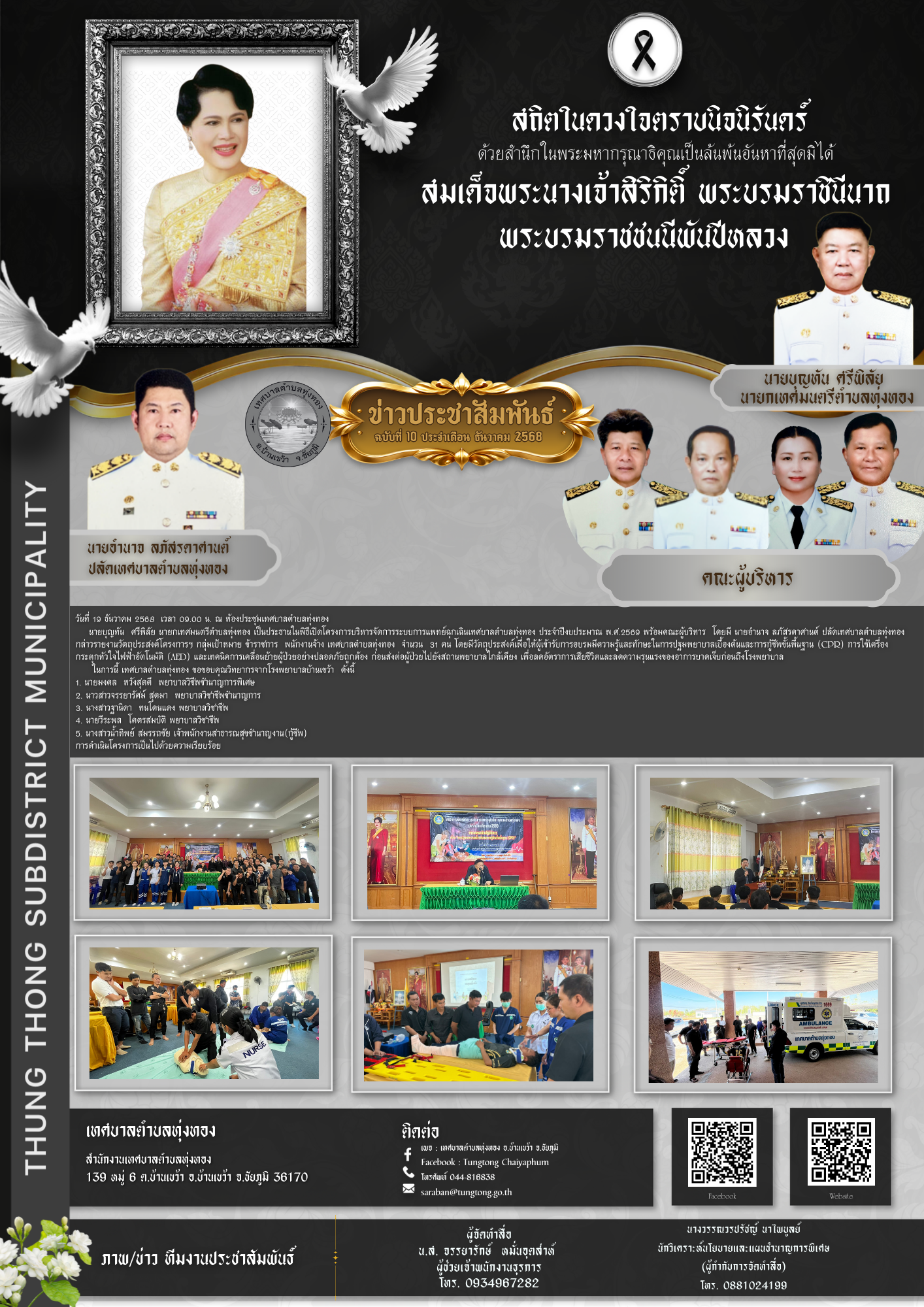นายบุญทัน ศรีพิลัย นายกเทศมนตรีตำบลทุ่งทอง เป็นประธานในพิธีเปิดโครงการบริหารจัดการระบบการแพทย์ฉุกเฉินเทศบาลตำบลทุ่งทอง ประจำปีงบประมาณ พ.ศ.2569 พร้อมคณะผู้บริหาร โดยมี นายอำนาจ ลภัสรดาศานต์ ปลัดเทศบาลตำบลทุ่งทอง กล่าวรายงานวัตถุประสงค์โครงการฯ กลุ่มเป้าหมาย ข้าราชการ พนักงานจ้าง เทศบาลตำบลทุ่งทอง จำนวน 31 คน โดยมีวัตถุประสงค์เพื่อให้ผู้เข้ารับการอบรมมีความรู้และทักษะในการปฐมพยาบาลเบื้องต้นและการกู้ชีพขั้นพื้นฐาน (CPR) การใช้เครื่องกระตุกหัวใจไฟฟ้าอัตโนมัติ (AED) และเทคนิคการเคลื่อนย้ายผู้ป่วยอย่างปลอดภัยถูกต้อง ก่อนส่งต่อผู้ป่วยไปยังสถานพยาบาลใกล้เคียง เพื่อลดอัตราการเสียชีวิตและลดความรุนแรงของอาการบาดเจ็บก่อนถึงโรงพยาบาล