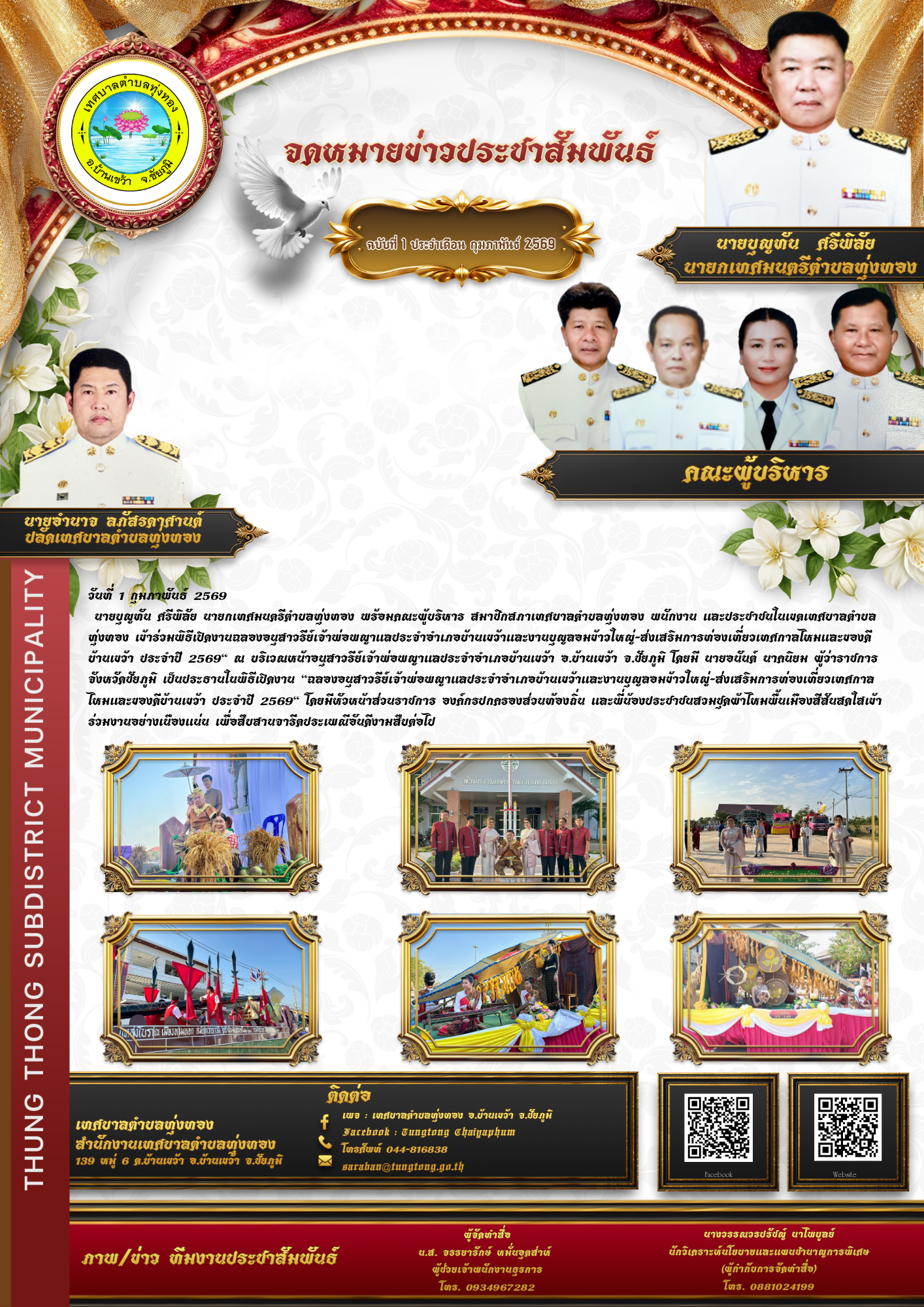 นายบุญทัน ศรีพิลัย นายกเทศมนตรีตำบลทุ่งทอง พร้อมคณะผู้บริหาร สมาชิกสภาเทศบาลตำบลทุ่งทอง พนักงาน และประชาชนในเขตเทศบาลตำบลทุ่งทอง เข้าร่วมพิธีเปิดงานฉลองอนุสาวรีย์เจ้าพ่อพญาแลประจำอำเภอบ้านเขว้าและงานบุญลอมข้าวใหญ่-ส่งเสริมการท่องเที่ยวเทศกาลไหมและของดีบ้านเขว้า ประจำปี 2569" ณ บริเวณหน้าอนุสาวรีย์เจ้าพ่อพญาแลประจำอำเภอบ้านเขว้า อ.บ้านเขว้า จ.ชัยภูมิ โดยมี นายอนันต์ นาคนิยม ผู้ว่าราชการจังหวัดชัยภูมิ เป็นประธานในพิธีเปิดงาน "ฉลองอนุสาวรีย์เจ้าพ่อพญาแลประจำอำเภอบ้านเขว้าและงานบุญลอมข้าวใหญ่-ส่งเสริมการท่องเที่ยวเทศกาลไหมและของดีบ้านเขว้า ประจำปี 2569" โดยมีหัวหน้าส่วนราชการ องค์กรปกครองส่วนท้องถิ่น และพี่น้องประชาชนสวมชุดผ้าไหมพื้นเมืองสีสันสดใสเข้าร่วมงานอย่างเนืองแน่น เพื่อสืบสานจารีตประเพณีอันดีงามสืบต่อไป